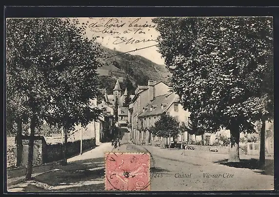AK Vic-sur-Cère, Vue de la rue principale avec arbres et bâtiments historiques