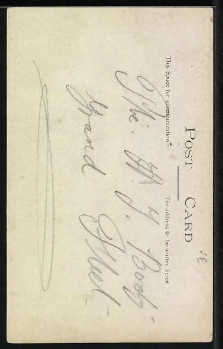 Personenbezogene Daten auf der Rückseite der Karte wurden durch blauen Textmarker unkenntlich gemacht. Die blauen Stellen sind auf die Vorderseite durchgeweicht und wirken sich negativ auf das Postkartenfoto aus