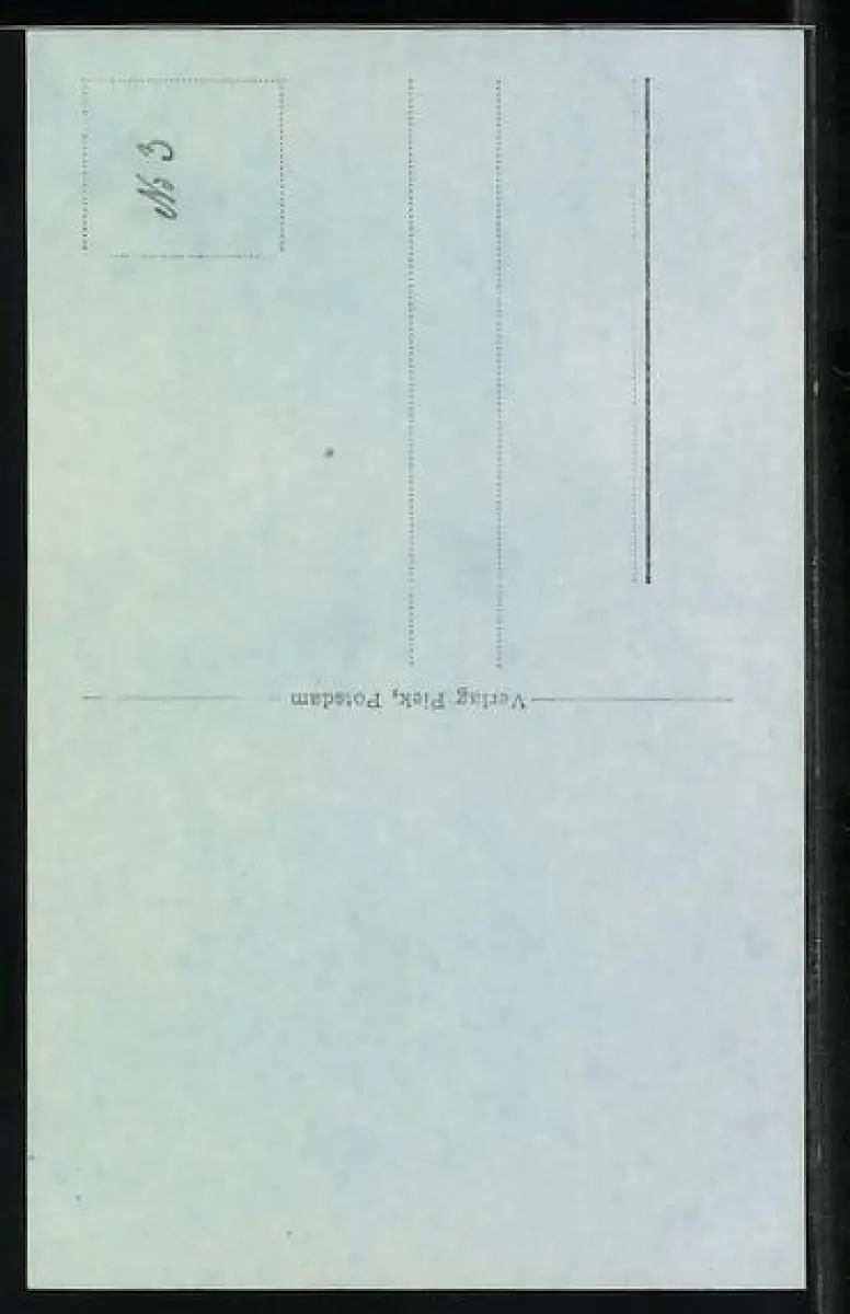 Personenbezogene Daten auf der Rückseite der Karte wurden durch blauen Textmarker unkenntlich gemacht. Die blauen Stellen sind auf die Vorderseite durchgeweicht und wirken sich negativ auf das Postkartenfoto aus