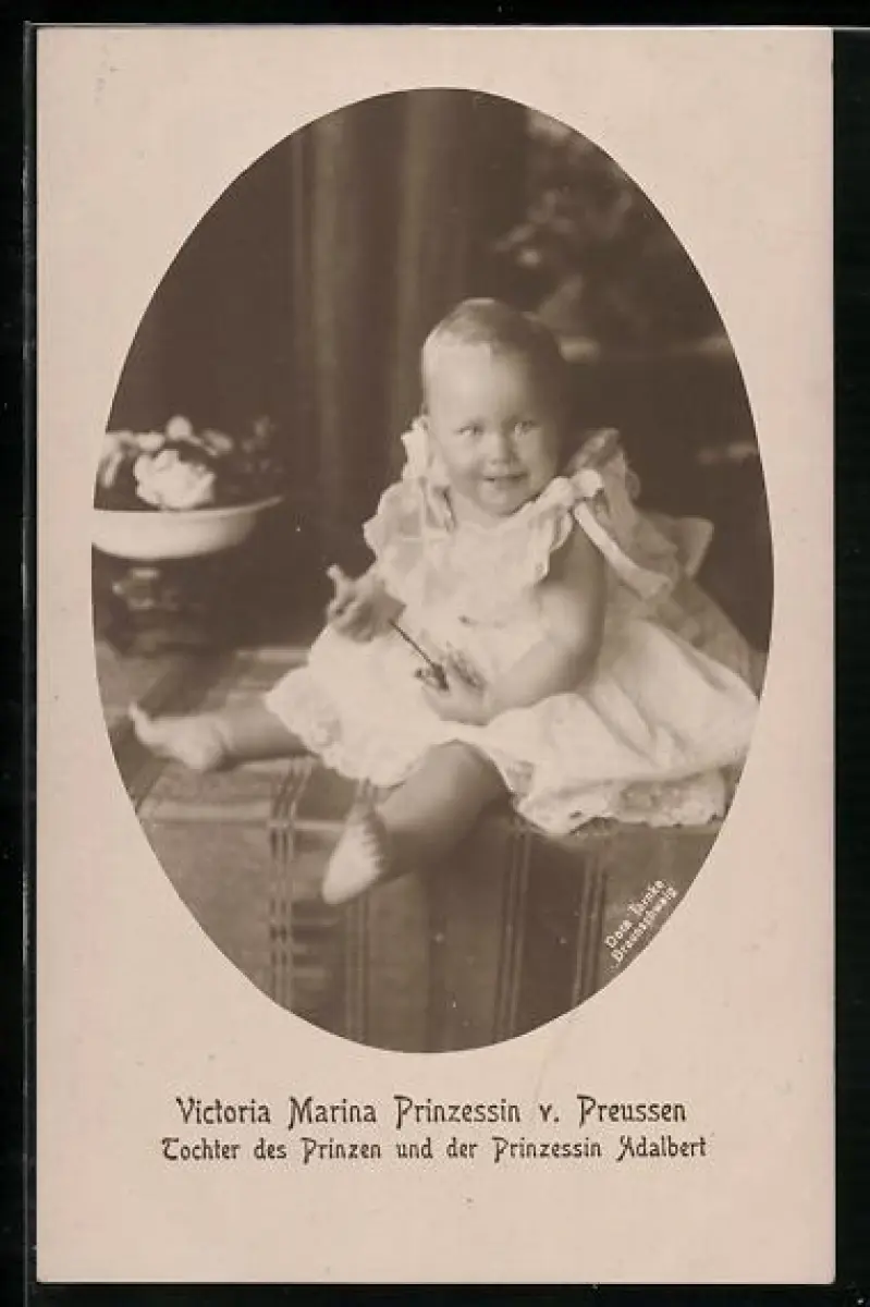 AK Victoria Marina Prinzessin v. Peussen im weissen Kleid auf Tisch sitzend