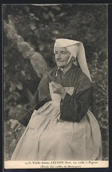 AK Vieille femme d`Elven filant, La coiffe à Pignon