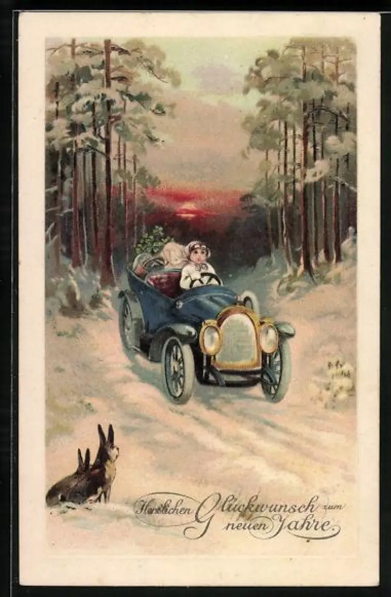 AK Viel Glück im Neuen Jahre, eine Frau fährt mit dem Automobil im Sonnenuntergang durch den Wald