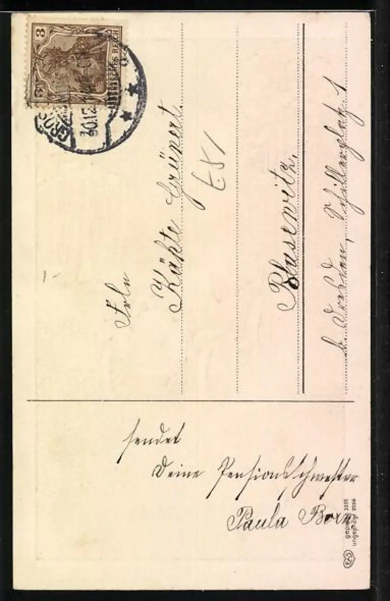 Personenbezogene Daten auf der Rückseite der Karte wurden durch blauen Textmarker unkenntlich gemacht. Die blauen Stellen sind auf die Vorderseite durchgeweicht und wirken sich negativ auf das Postkartenfoto aus