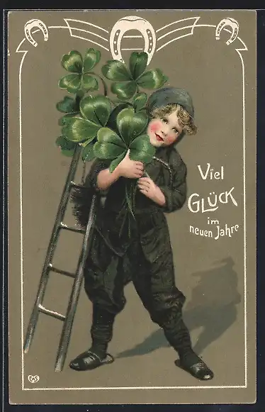 AK Viel Glück im neuen Jahre, Kleiner Schornsteinfeger mit Klee