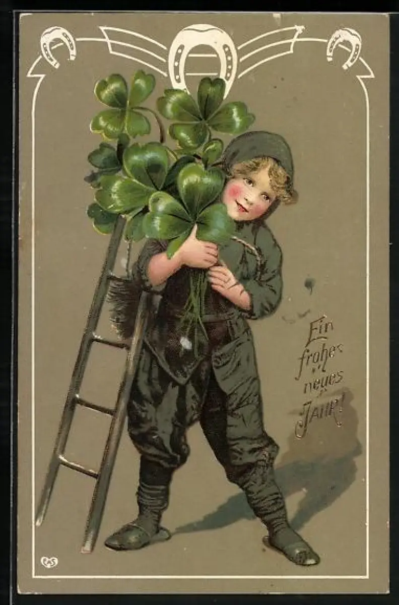 AK Viel Glück im neuen Jahre, Kleiner Schornsteinfeger mit Klee