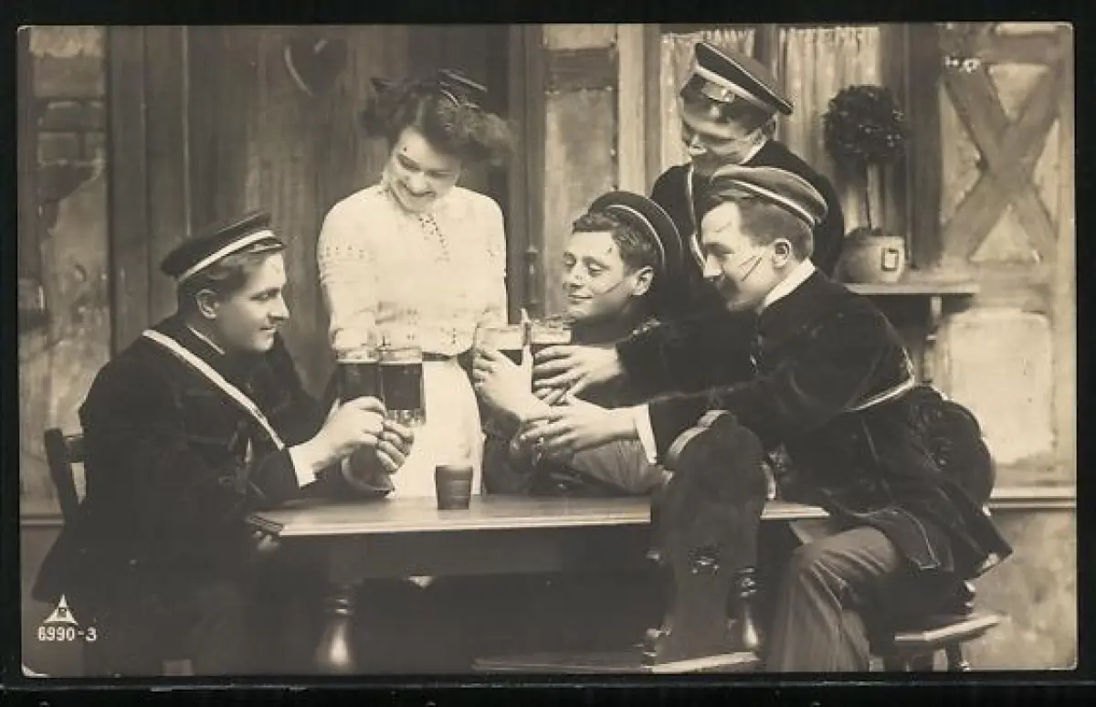 AK Vier Studenten mit Dame beim Umtrunk