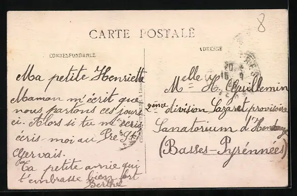 Personenbezogene Daten auf der Rückseite der Karte wurden durch blauen Textmarker unkenntlich gemacht. Die blauen Stellen sind auf die Vorderseite durchgeweicht und wirken sich negativ auf das Postkartenfoto aus