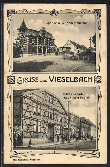 AK Vieselbach, Gasthof zum Thüringer Hof R. Hecker mit Strasse, Sparkasse und Kriegerdenkmal