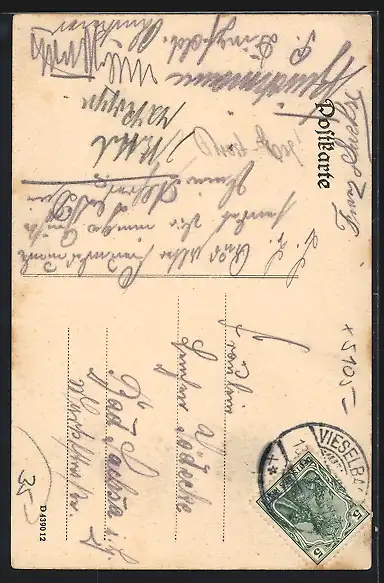 Personenbezogene Daten auf der Rückseite der Karte wurden durch blauen Textmarker unkenntlich gemacht. Die blauen Stellen sind auf die Vorderseite durchgeweicht und wirken sich negativ auf das Postkartenfoto aus