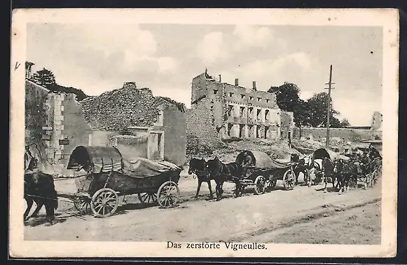 AK Vigneulles, Pferdekarren ziehen an Ruinen vorbei durch die verwüstete Stadt