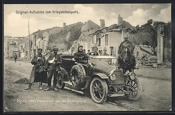 AK Vigneulles, Strassenpartie mit Automobil nach der Beschiessung