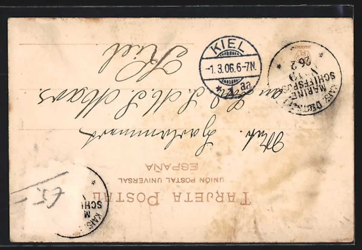 alte Ansichtskarte, gelaufen 1906, Stempelspur, Briefmarke entfernt, rückseitig Oberflächenschaden, guter Zustand