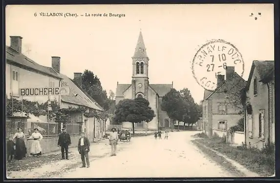 AK Villabon, La route de Bourges avec église et boucherie
