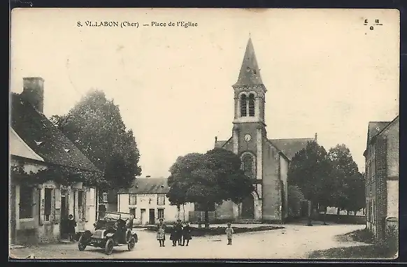 AK Villabon, Place de l`Église avec voiture ancienne et habitants