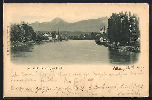 AK Villach, Blick von einer Brücke über die Drau, um 1900