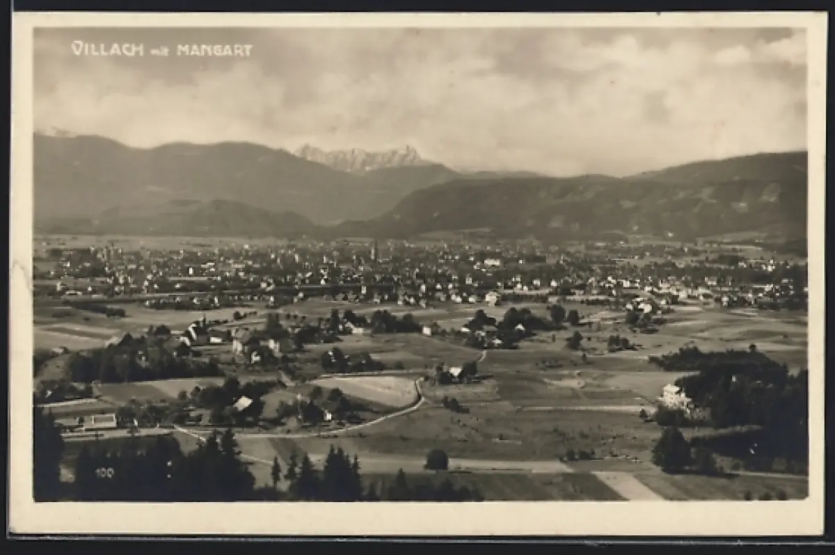 AK Villach, Gesamtansicht mit Mangart aus der Vogelschau