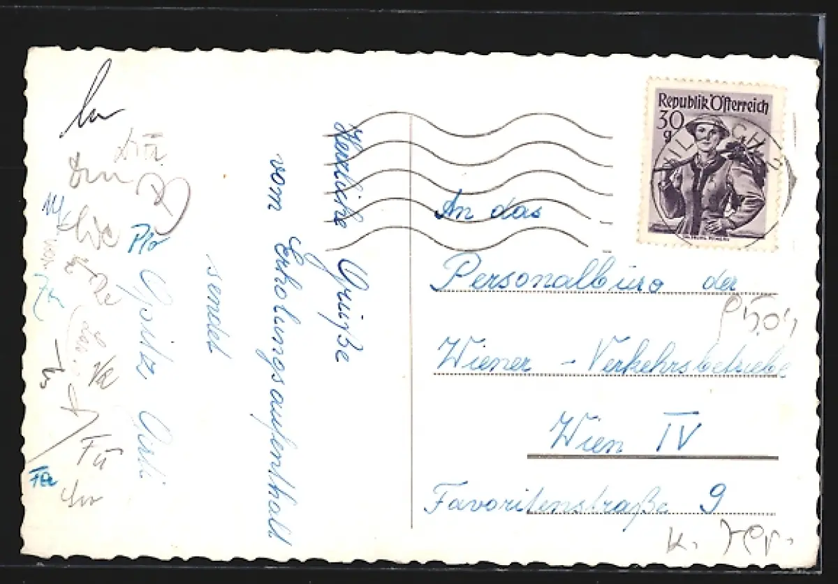 Personenbezogene Daten auf der Rückseite der Karte wurden durch blauen Textmarker unkenntlich gemacht. Die blauen Stellen sind auf die Vorderseite durchgeweicht und wirken sich negativ auf das Postkartenfoto aus