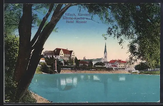 AK Villach /Kärnten, Nikolaikirche und Hotel Moser