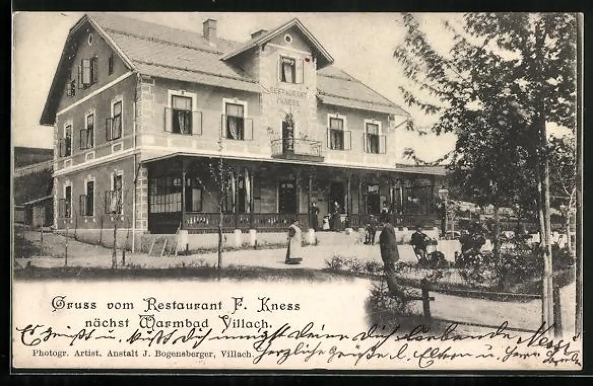 AK Villach, Restaurant F. Kness mit Gartenanlage