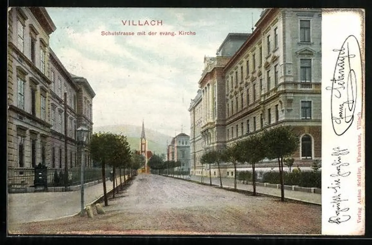 AK Villach, Schulstrasse mit der evangelischen Kirche