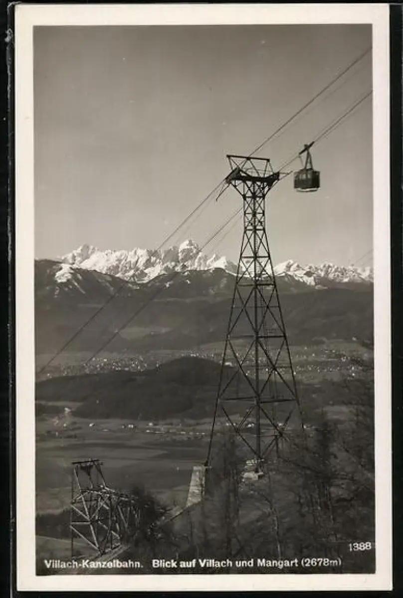 AK Villach, Villach-Kanzelbahn mit Blick auf den Ort und Mangart