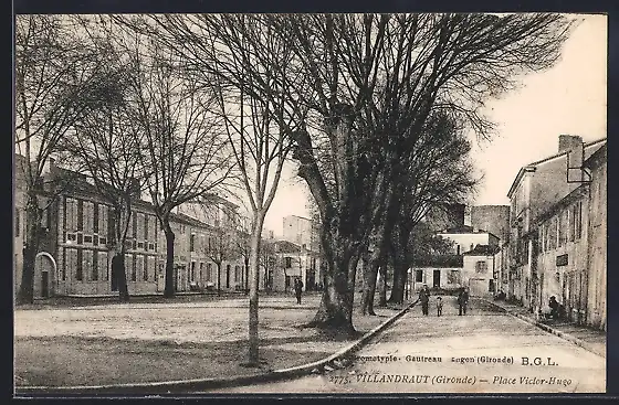 AK Villandraut, Place Victor-Hugo avec arbres et bâtiments adjacents