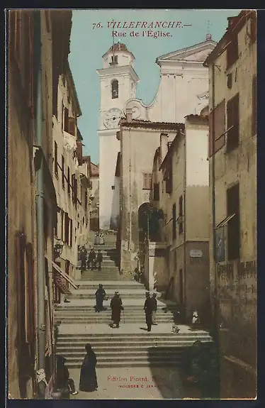 AK Villefranche, Rue de l`Église et vue de l`église en arrière-plan