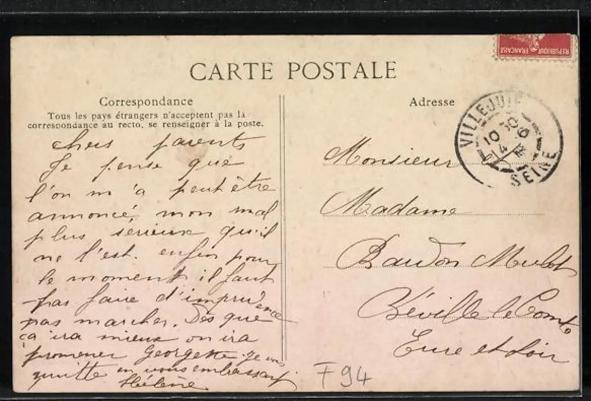 Personenbezogene Daten auf der Rückseite der Karte wurden durch blauen Textmarker unkenntlich gemacht. Die blauen Stellen sind auf die Vorderseite durchgeweicht und wirken sich negativ auf das Postkartenfoto aus