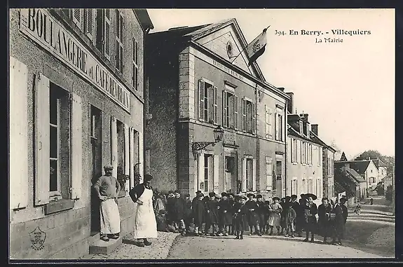 AK Villequiers, La Mairie et la boulangerie avec habitants rassemblés