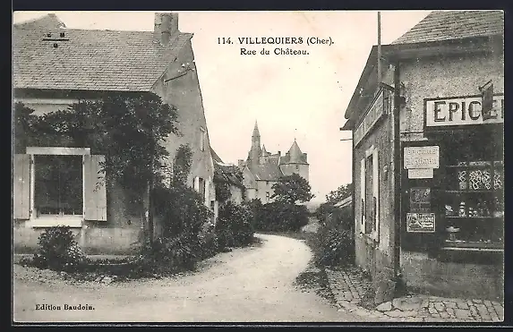 AK Villequiers, Rue du Château avec épicerie et vue sur le château