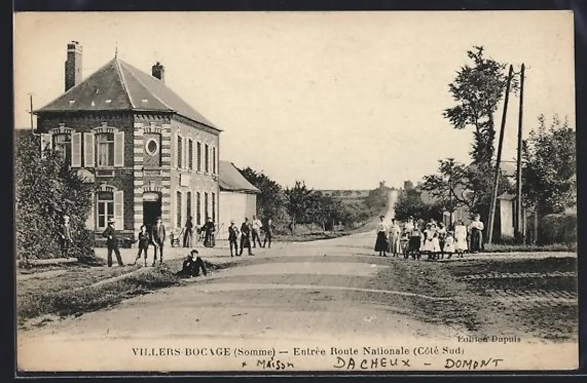 AK Villers-Bocage /Somme, Entrée Route Nationale côté sud avec des passants et une maison en briques