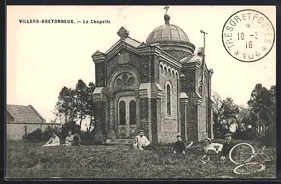 AK Villers-Bretonneux, La Chapelle avec des personnes assises sur l`herbe devant