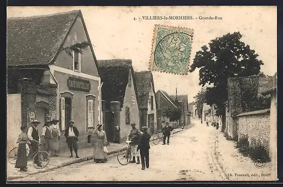 AK Villiers-le-Morhier, Scène animée dans la Grande-Rue avec cyclistes et passants