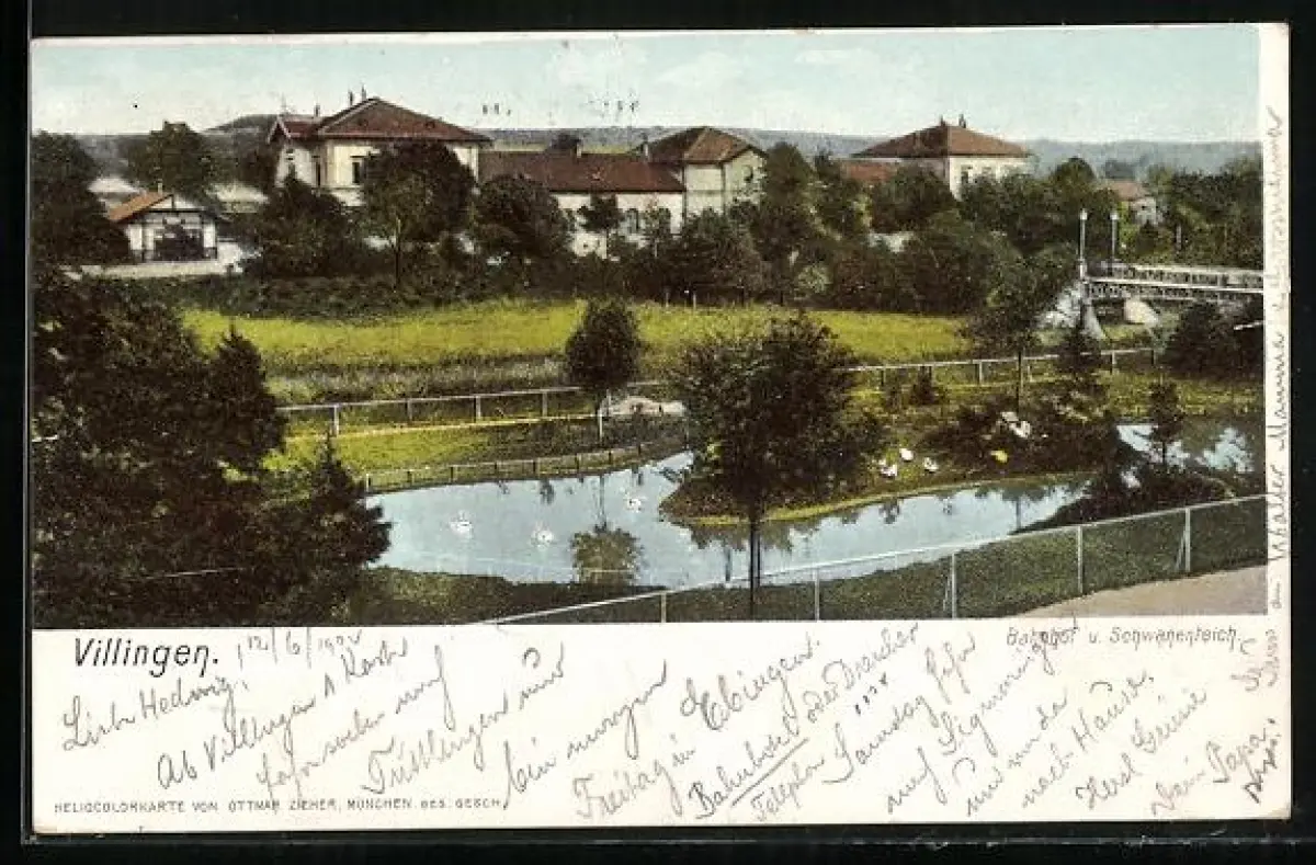 AK Villingen / Baden, Bahnhofsgebäude und Schwanenteich