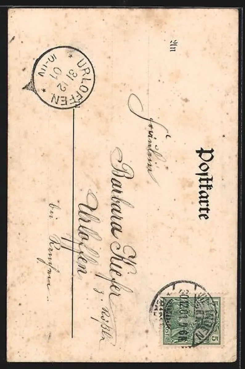 Personenbezogene Daten auf der Rückseite der Karte wurden durch blauen Textmarker unkenntlich gemacht. Die blauen Stellen sind auf die Vorderseite durchgeweicht und wirken sich negativ auf das Postkartenfoto aus
