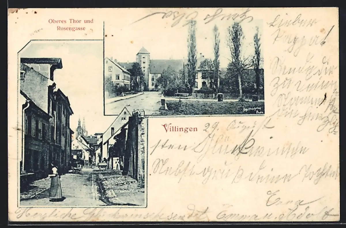 AK Villingen / Baden, Oberes Tor und Strasse Rosengasse