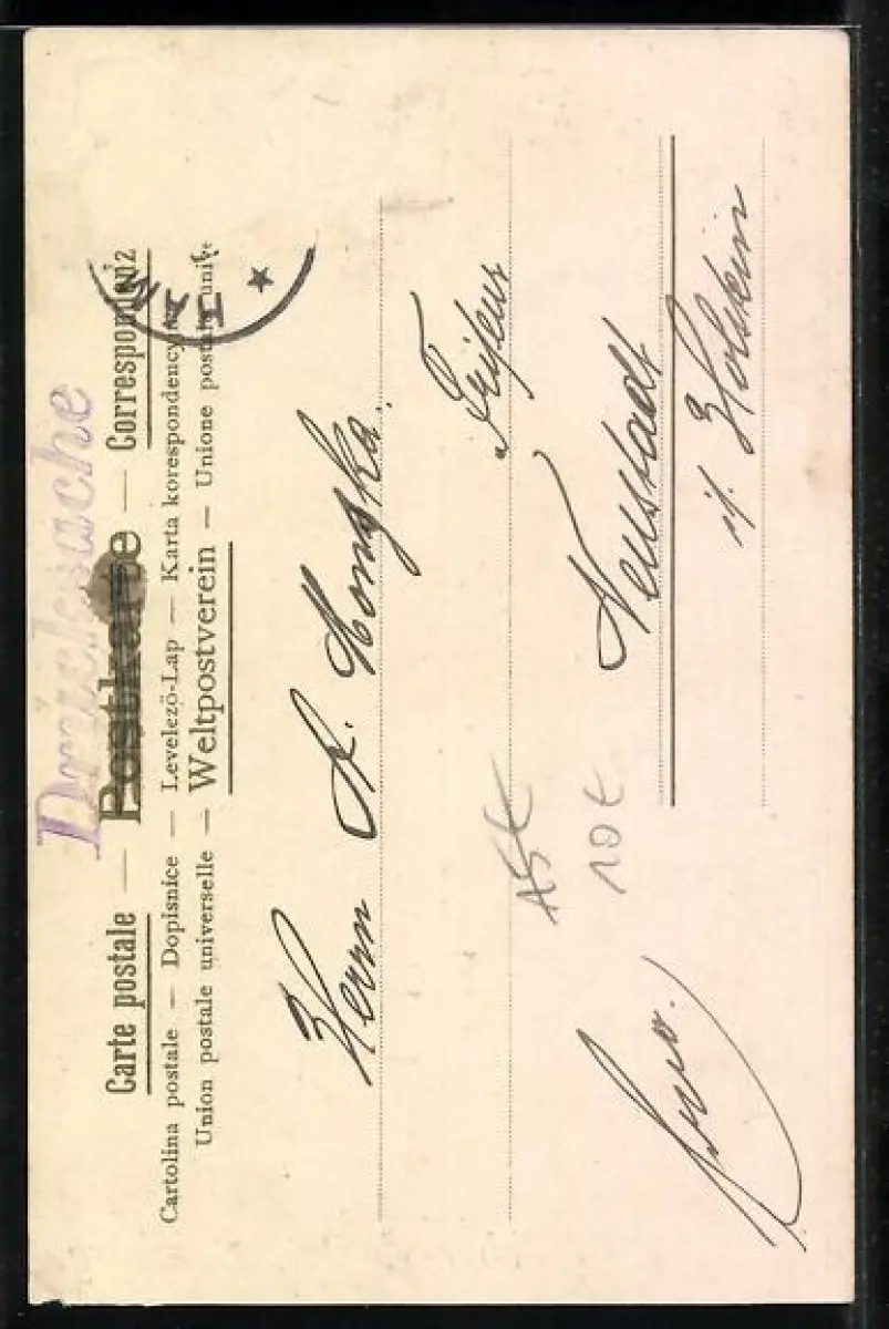 Personenbezogene Daten auf der Rückseite der Karte wurden durch blauen Textmarker unkenntlich gemacht. Die blauen Stellen sind auf die Vorderseite durchgeweicht und wirken sich negativ auf das Postkartenfoto aus