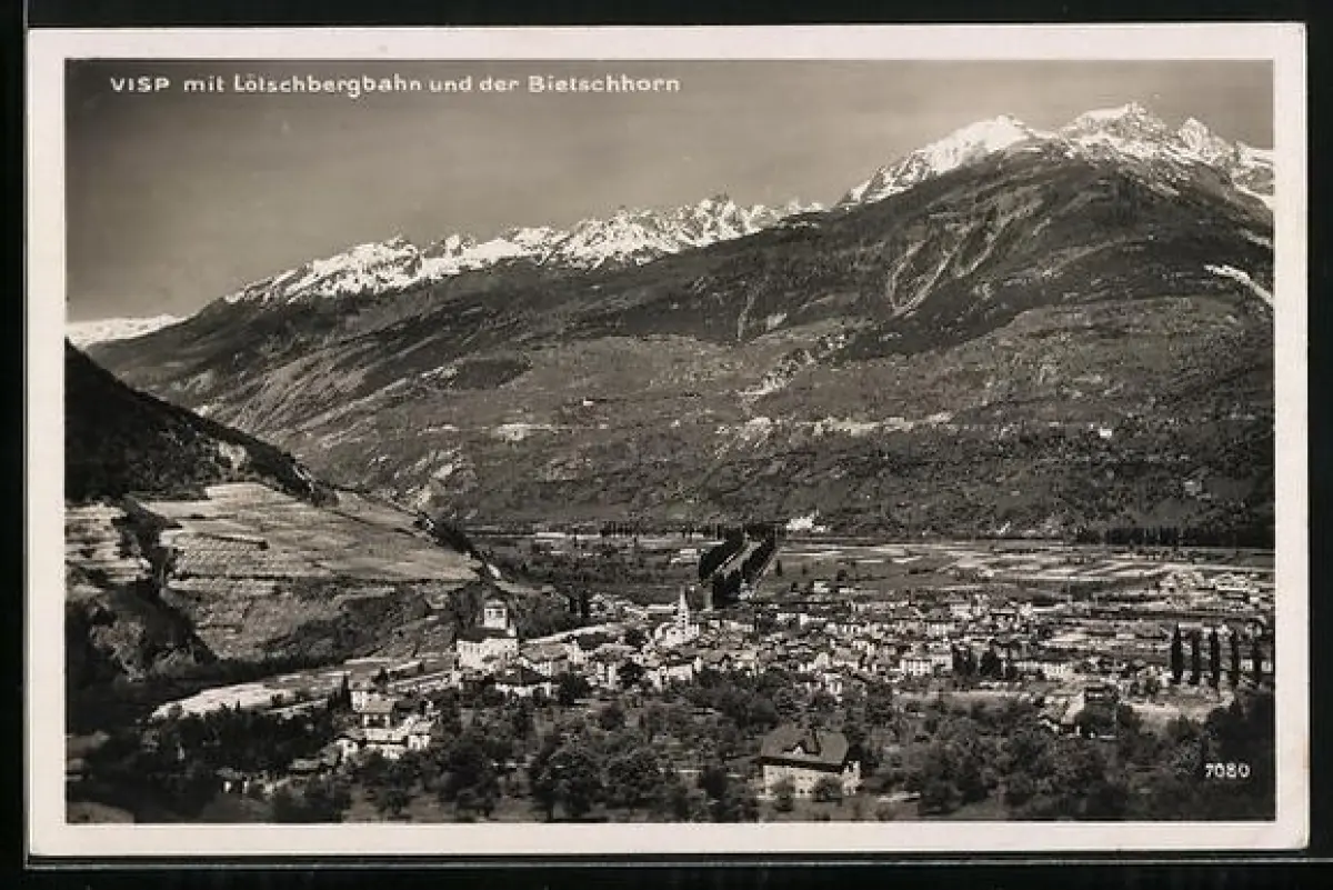 AK Visp, Panorama mit Lötschbergbahn und Bietschhorn