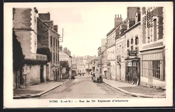 AK Vitré /I.-et-V., Rue du 70e Régiment d`Infanterie avec voitures et bâtiments historiques