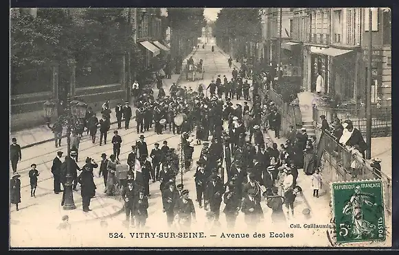 AK Vitry-sur-Seine, Défilé sur l`Avenue des Écoles avec foule et fanfare animée
