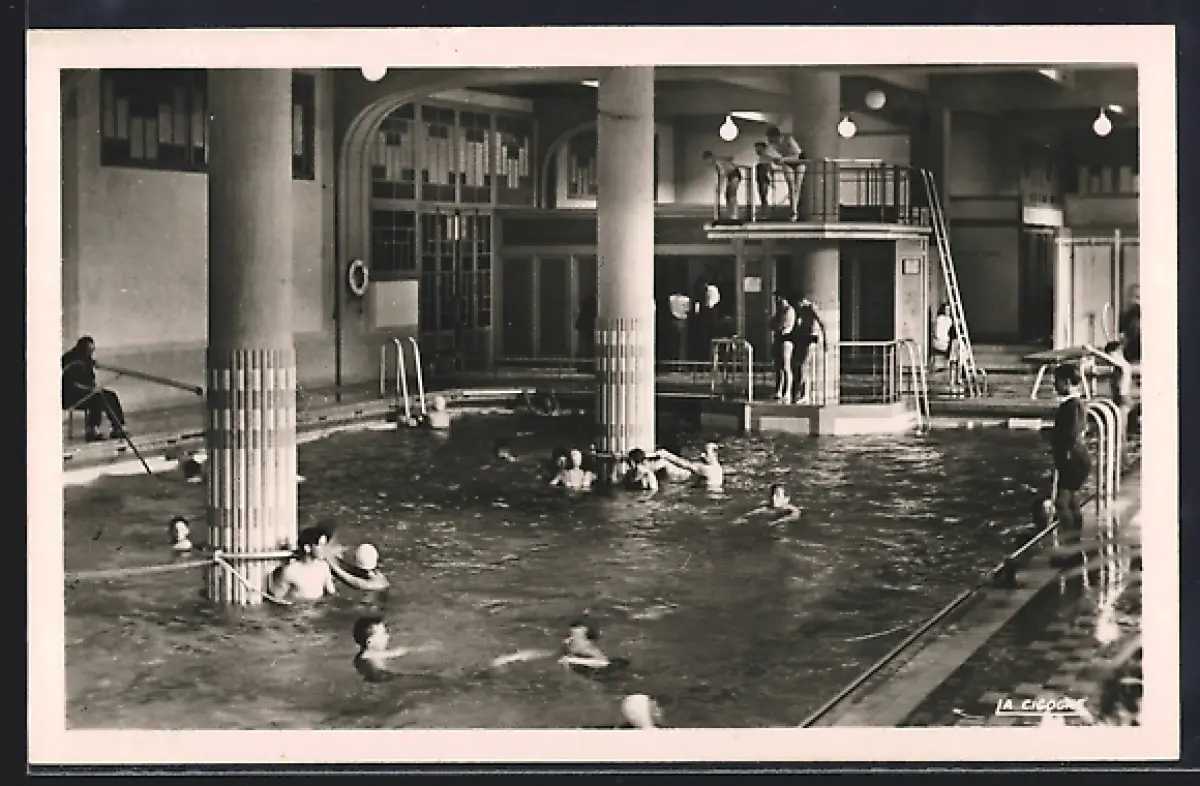 AK Vittel, La piscine, vue intérieure animée avec des baigneurs et plongeoir