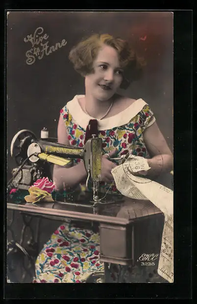 AK Vive St-Anne, Junge Frau im bunten Kleid an einer Singer-Nähmaschine