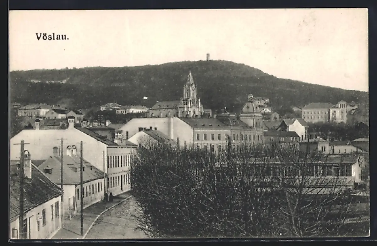 AK Vöslau, Teilansicht mit Strasse, Kirche und Turm aus der Vogelschau