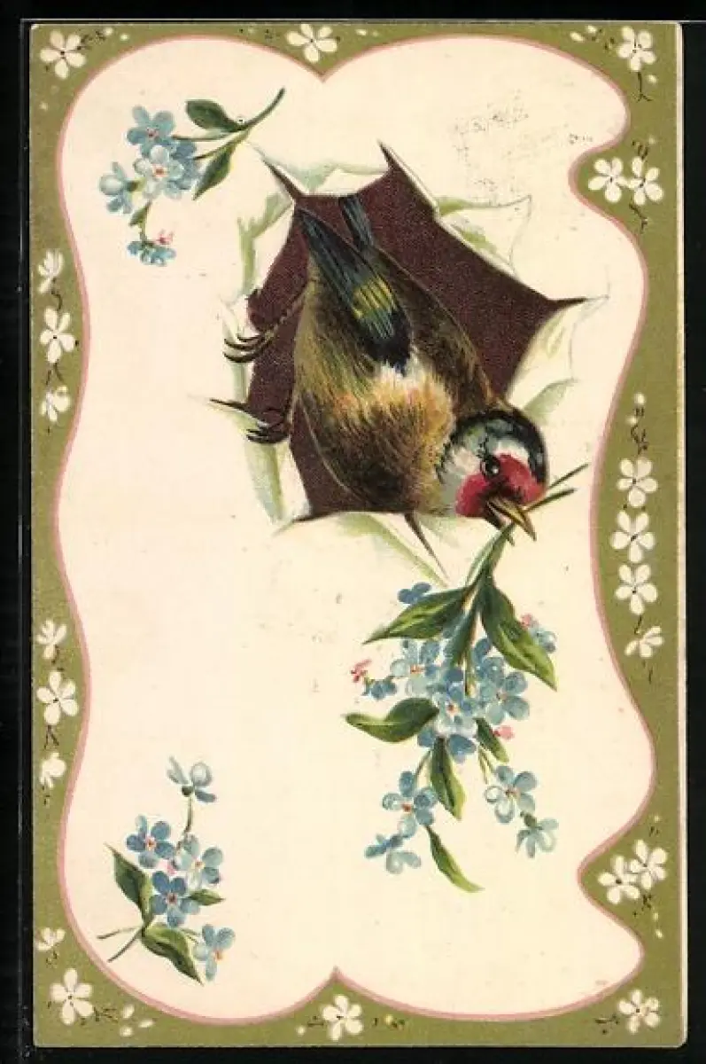 AK Vogel mit Vergissmeinnicht im Schnabel