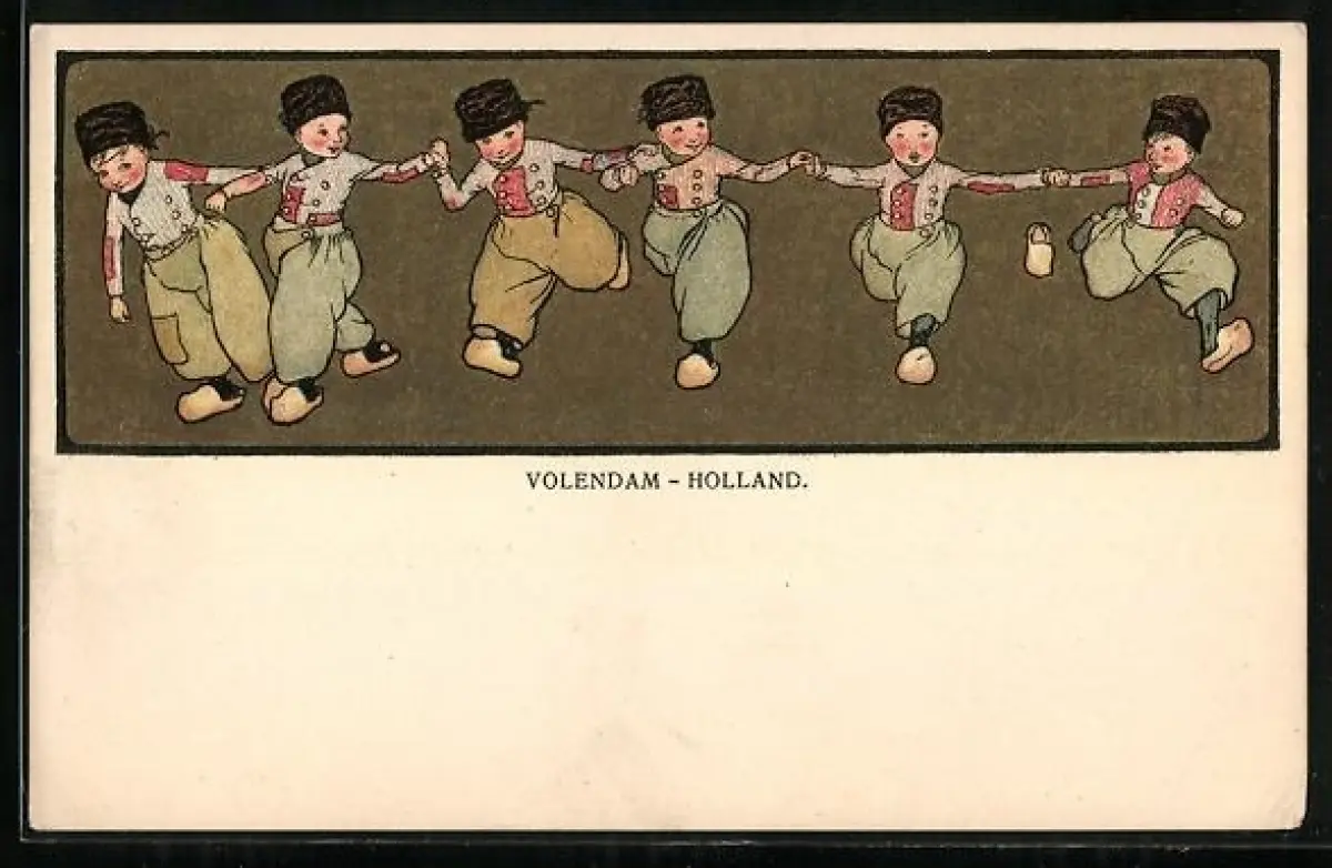 AK Volendam, Niederländische Jungen mit Holzschuhen rennen Hand in Hand