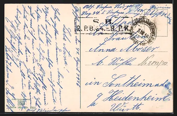 Personenbezogene Daten auf der Rückseite der Karte wurden durch blauen Textmarker unkenntlich gemacht. Die blauen Stellen sind auf die Vorderseite durchgeweicht und wirken sich negativ auf das Postkartenfoto aus