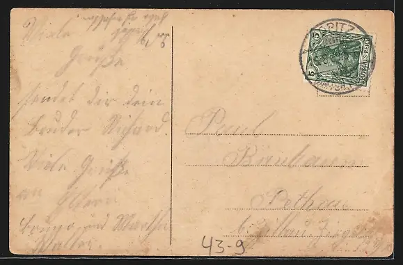 gelaufen 1909, Eckknicke links u. rechts unten, guter Zustand
