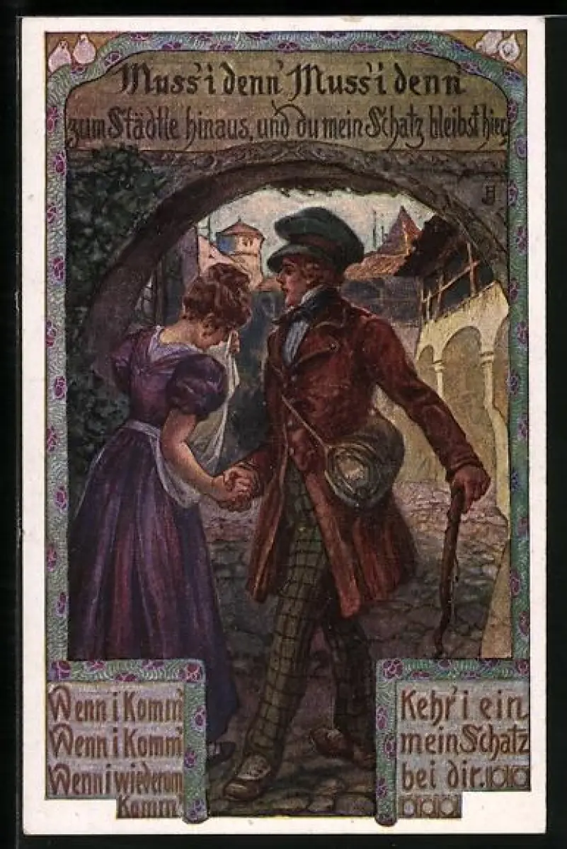 AK Volkslied Nr. 4, Muss i dennn, muss i denn, Wanderer verabschiedet sich von seinem Schatz