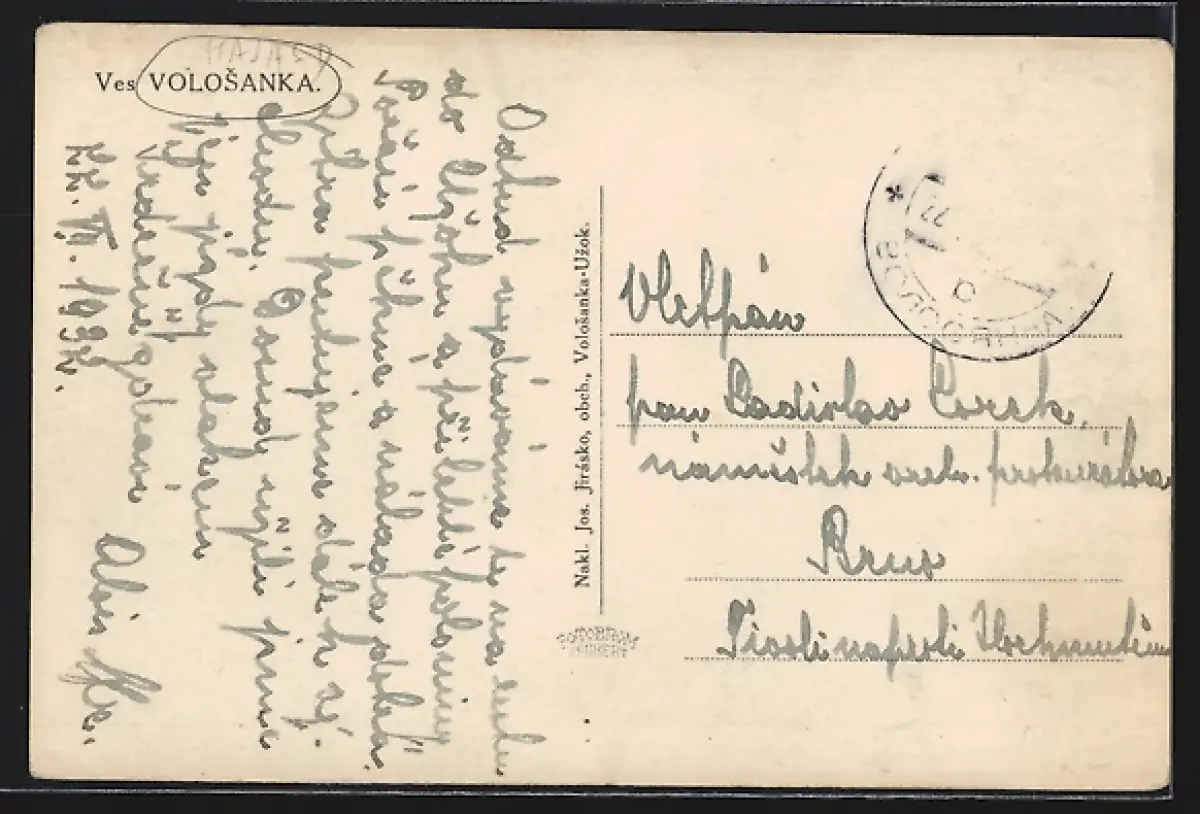 Personenbezogene Daten auf der Rückseite der Karte wurden durch blauen Textmarker unkenntlich gemacht. Die blauen Stellen sind auf die Vorderseite durchgeweicht und wirken sich negativ auf das Postkartenfoto aus