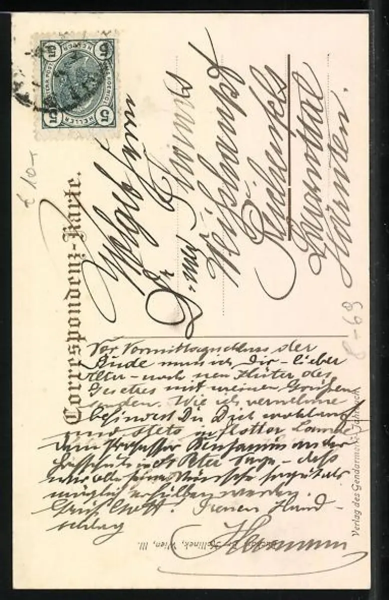 Personenbezogene Daten auf der Rückseite der Karte wurden durch blauen Textmarker unkenntlich gemacht. Die blauen Stellen sind auf die Vorderseite durchgeweicht und wirken sich negativ auf das Postkartenfoto aus